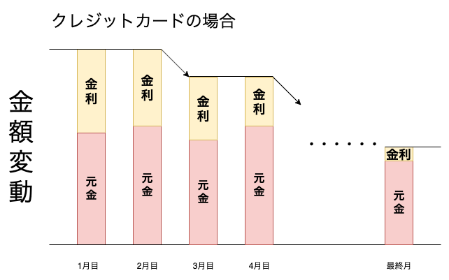 一方、クレジットカードの場合、月々の支払額が変動します。(クレジットカードでも固定額返済を設定することが可能な場合も多いですが、自ら設定をしないと変動する場合が多いです)
