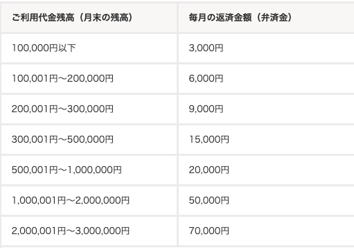 例えば、オリコカードの場合、下記の表のように残債の額で返済額が変動していきます。